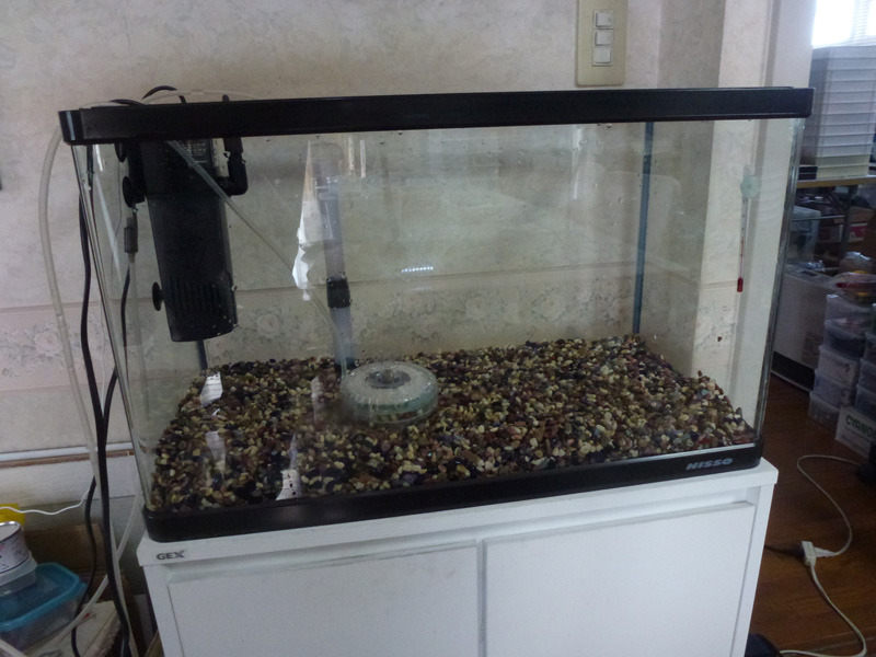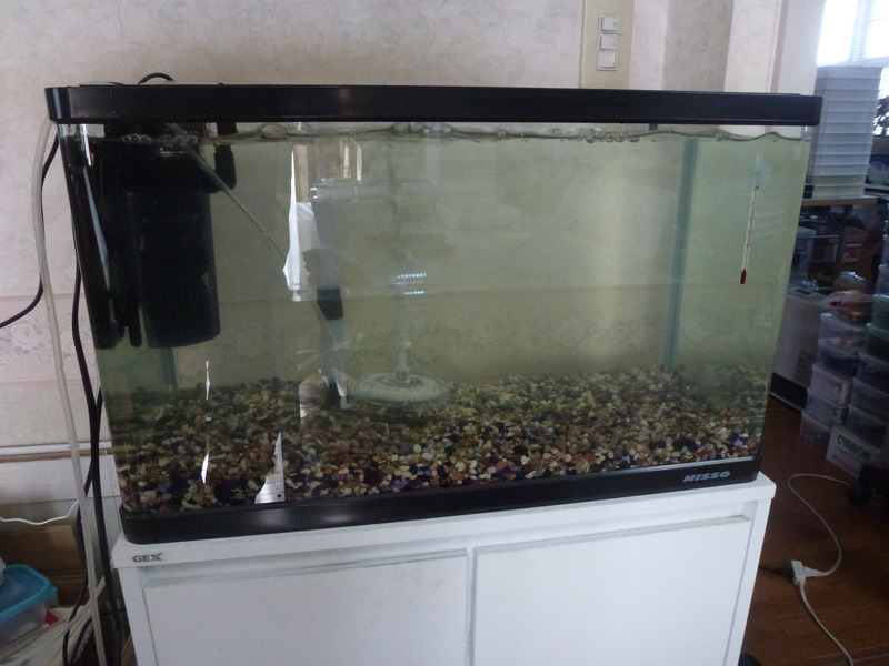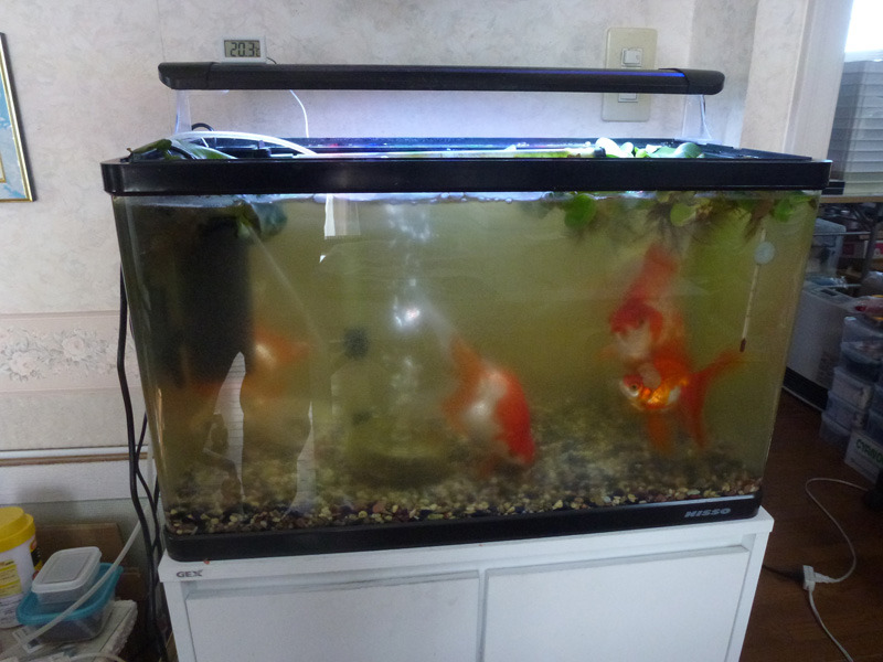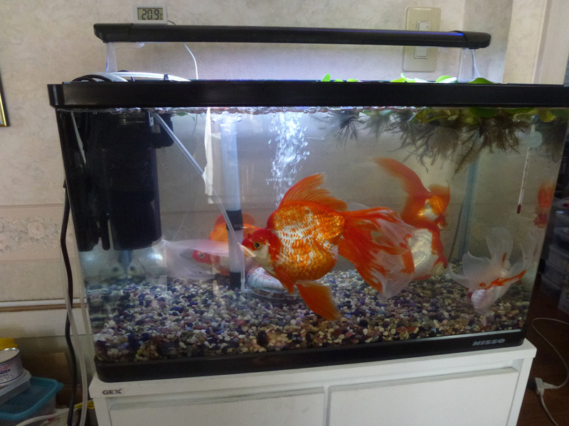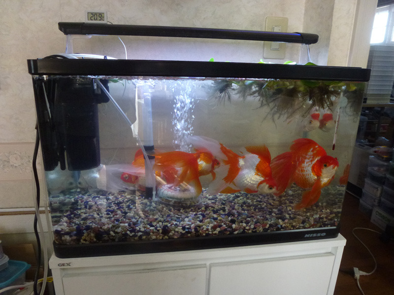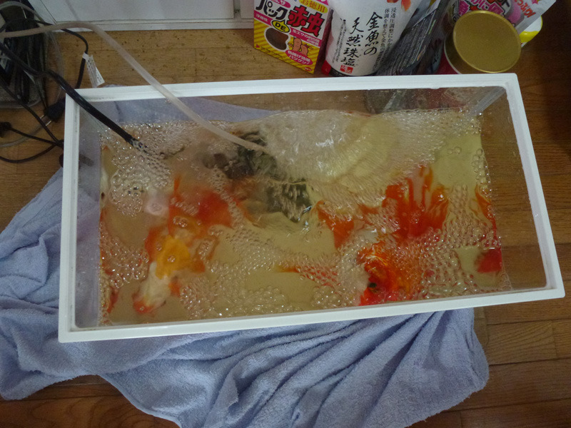 水替えの間、金魚たちはブクブクで遊んでいます。