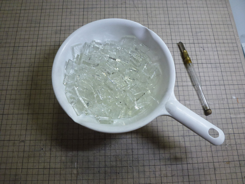 小さな四角にカットしてソーダガラスペンの材料になります。